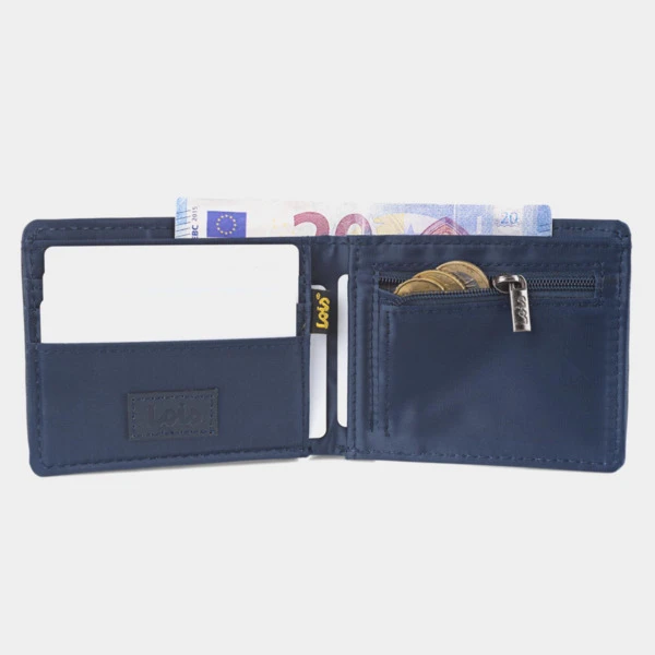 Cartera hombre con monedero de la marca Lois. Diseño único y exclusivo de la marca. Características Especiales: Con departamento para billetes. Con portamonedas interior con cierre de cremallera. Capacidad para 5 tarjetas. Con protección RFID. Material: Lona y PVC Interior: Nylon y forro estampado con logo de la marca. A destacar el cursor personalizado , y la combinación de diferentes materiales. Medidas: 10,5×8,5×1 cm. Peso: 0,09 kg. Material: Lona-Pvc.