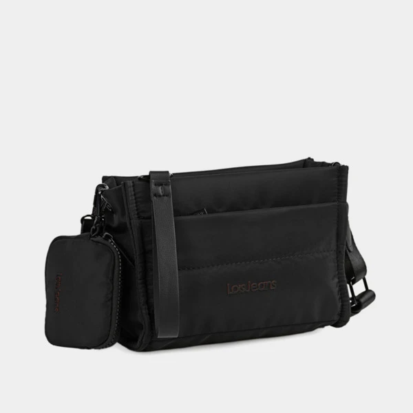 Bolso bandolera con función de cartera de mano. Con asa larga extraíble. Bolsillo trasero e interior con cierre de cremallera. A destacar el material, el logo con serigrafia con relieve, el monedero colgante que va en cada artículo, la cinta personalizada y el cursor principal con función de asa de mano.