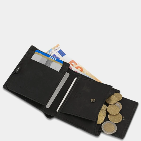 Con solapa interior y capacidad para 9 tarjetas. Portamonedas interior con cierre presión. Con departamento para billetes.