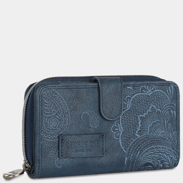 Billetero – Monedero de la marca Lois. Cierre con botón a presión. Monedero con tres compartimentos, el central con cremallera. Billetero con solapa interior y con múltiples apartados con capacidad para 15 tarjetas y documentación, tres de ellos translúcidos. Dos compartimentos para billetes, uno abierto y uno cerrado con cremallera.