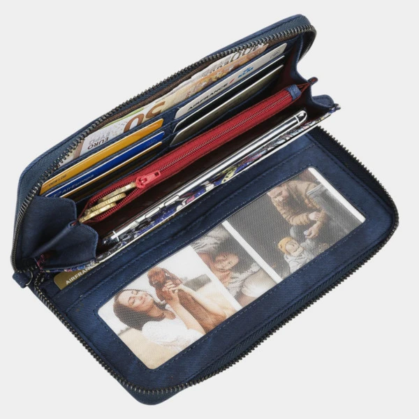 Billetero de la marca Skpa T con asa de mano adicional. Cierre con cremallera. Tiene tres compartimentos interiores, el central con cremallera. Capacidad para trece tarjetas y documentación el cual uno de ellos es translúcido. Forro interior estampado con el logo de la marca.