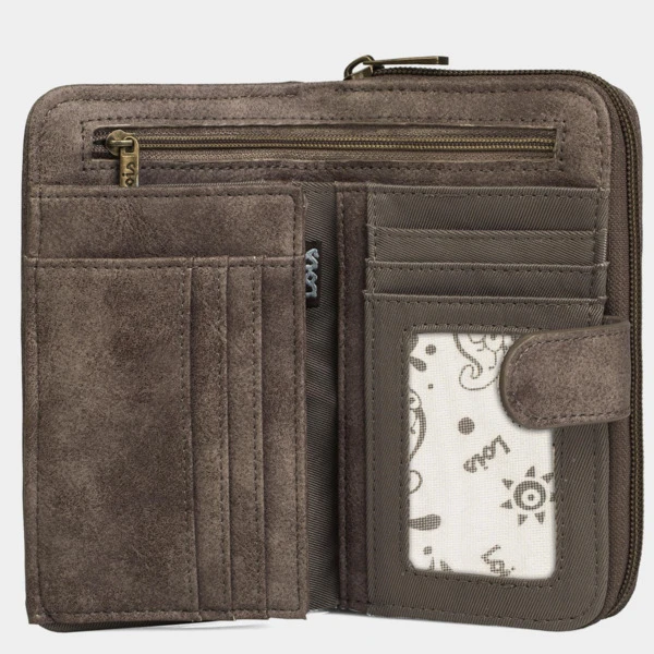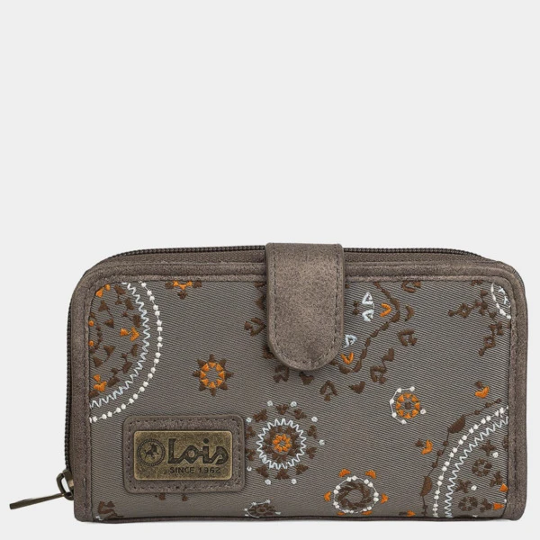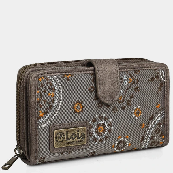 Cartera para mujer de la nueva colección ATUK de la marca LOIS, diseñada y pensada para uso diario. LOIS no pierde de vista las tendencias del mundo de la moda, sin olvidar su sello característico que diferencia la marca. Con acabados perfectos, combina colores, diseños, motivos y bordados para llegar a un resultado precioso y combinable para tu look más Casual. Para proteger tu dinero y tus tarjetas, el interior cuenta con un revestimiento RFID, esta tecnología no permite el acceso por radio frecuencias, tu tranquilidad está asegurada. Caracteríticas: Exterior: Logo incrustado en bronce. Lona y Cuero PU, con bordados de motivos Mandala. Cierre con solapa y botón. Cierre principal con cremallera de deslizamiento suave. Interior: Compartimento general con forro de nylon estampado. 15 compartimentos para tarjetas, dos de ellos traslúcidos para documentos. 3 compartimentos para monedas y varios, uno de ellos con cremallera individual. 2 compartimentos par billetes, uno de