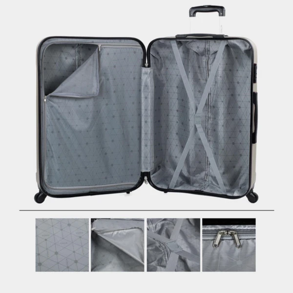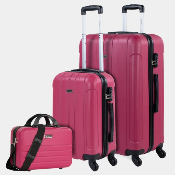 ITACA lanza un nuevo juego de maletas de viaje rígidas. Set de neceser + 2 maletas tamaño 50/70 realizadas con ABS, un material ligero y a la vez resistente. Otra ventaja es que permite mayor maniobrabilidad con sus 4 ruedas giratorias 360° multidirección de suave rodamiento y su trolley telescópico con seguro hacen que su manejo sea más cómodo. Dispone de una cremallera con doble cursor y cerradura con combinación LOCK para una mayor seguridad. En su interior, contemplamos el forro personalizado de la marca, con separación central. Contiene correas elásticas interiores que permiten la sujeción del contenido. Cabina (Cumple la normativa de equipaje de mano de EasyJet, Iberia, Ryanair, etc.)
