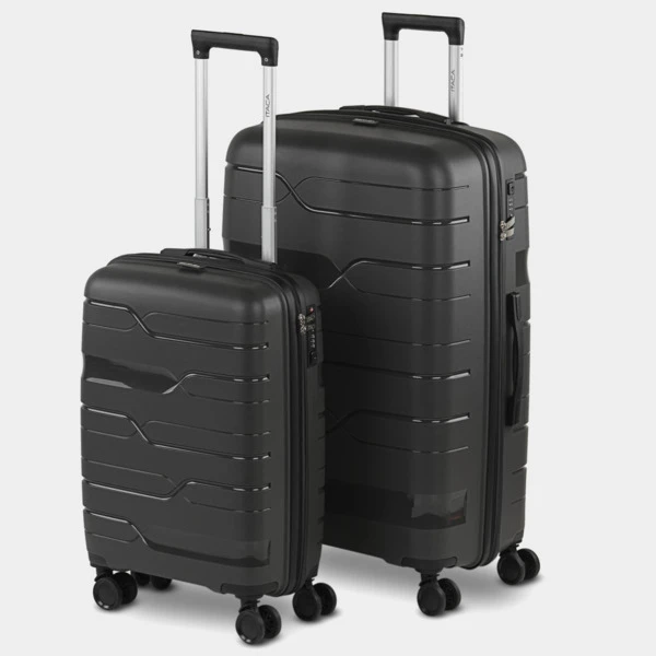 Juego de 2 maletas de viaje con ruedas de la firma ITACA fabricadas con Polipropileno PP. Hemos utilizado Polipropileno de alta tecnología. Este material es ultra resistente y súper ligero, el mejor material sintético para la fabricación de maletas. Alta resistencia y durabilidad. Combinación ideal para viajes largos. Son las maletas más recientes y de mayor calidad. la evolución de la marca ITACA continua buscando la mejor calidad a el mejor precio. Este set de 2 maletas te ofrece una combinación ideal para todo tipo de viajes, de fin de semana, cortos y largos. Para homologar internacionalmente, hemos incorporado la cerradura TSA, de esta forma no tendrás problemas en ninguna aduana de mundo. Características principales: Dimensiones: Cabina (Cumple la normativa de equipaje de mano de EasyJet, Iberia, Ryanair, etc.). Total: 39.5 x 55 x 21 cm. Volumen: 39 L. Peso: 3.20 kg. Grande XL: Total: 55 x 77.5 x 33 cm. Volumen: 110 L. Peso: 4,60 kg. Exterior: Material: