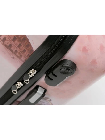 Cierre con cremalleras y candado de combinación. Dispone de 4 ruedas que realizan un giro completo de 360º.