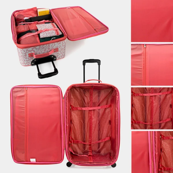 Juego completo set de 2 maletas trolley mas bolsas organizdoras con rejilla de ventilación, bolsa para zapatos, estuche de mano y bolsa grande de hombro de la firma ITACA. 4 ruedas giratorias y mango telescópico. Forro interior. Compartimento separador con cremallera y bandas elásticas ajustables. Varios compartimentos. Set Maletas de viaje con ruedas – Maleta tela Poliester 100% Alta resistencia y durabilidad, este producto es el resultado de la evolución de la marca ITACA en su continua búsqueda de la mejor calidad al mejor precio. Maletas de viaje cabina , pequeña y mediana. El interior está forrado con Nylon personalizado acorde al diseño de la maleta. Para la organización del equipaje cuenta con correas, bolsillos y cremalleras para asegurar la sujeción y el orden. Las 4 ruedas aseguran un transporte fácil y manejable, el asa extensible adapta la maleta a cualquier altura de usuario. Perfectas para aerolíneas 23 kilos facturada y 10 kilos cabina. Medidas: 39,5x67x23 cm. Peso: 6 k