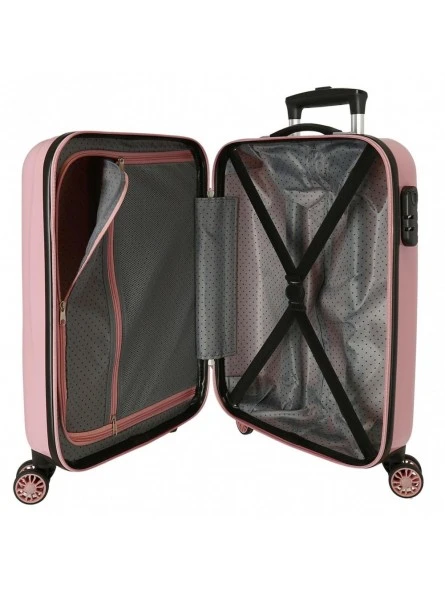 Maleta de cabina de 38x55x20 cm. (ruedas y asa incluida). Tiene una capacidad de 34 litros y pesa 2,6 kg. Fabricada en ABS, un material resistente y ligero.