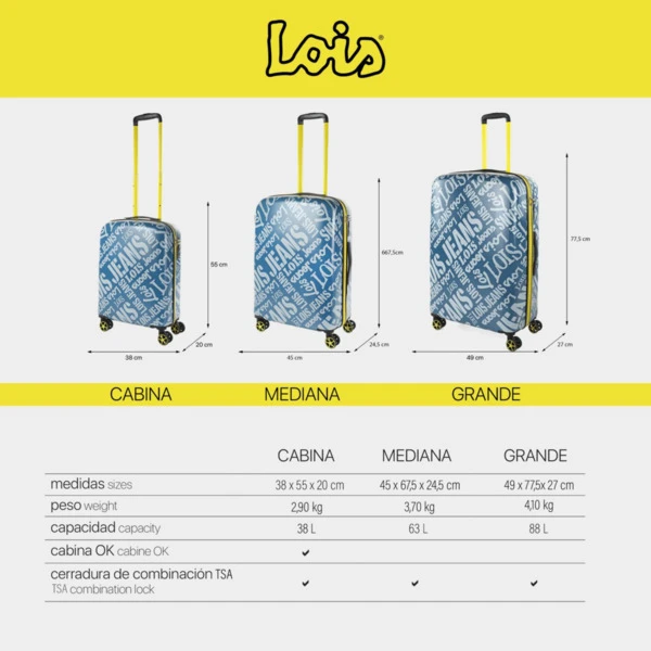 Maletas trolley de la marca Lois tamaños 50 realizada con ABS-PET, un material ligero y a la vez resistente.
