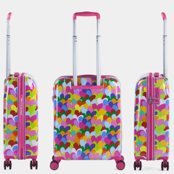 Maleta Cabina de Viaje Rígida Trolley 4 Ruedas Policarbonato Estampado de la firma AGATHA RUIZ DE LA PRADA. Siempre original, AGATHA RUIZ DE LA PRADA ha sabido mantenerse en la actualidad del mundo de la moda, fiel a su personalidad y estilo. Todos los productos AGATHA RUIZ DE LA PRADA marcan tendencia con sus atrevidos diseños. Esta maleta te ofrece una solución ideal para viajes de fin de semana. Las maletas AGATHA RUIZ DE LA PRADA están diseñadas para tu máximo confort en el viaje. Características principales Dimensiones Cabina (Cumple la normativa de equipaje de mano de EasyJet, Iberia, Ryanair, etc.) Total: 55x40x20 cm Cuerpo: 48x39x20 cm Volumen: 35 L Peso: 2,9 kg Exterior Material: Policarbonato Estampado. Cierre: Candado de combinación integrado de 3 dígitos para mayor seguridad. Cremallera: De doble cursor con orificios para candado. Deslizamiento muy suave. Asas: Asa retráctil superior. Máxima comodidad en cualquier posición. Mango: Mango telescópico ergonó