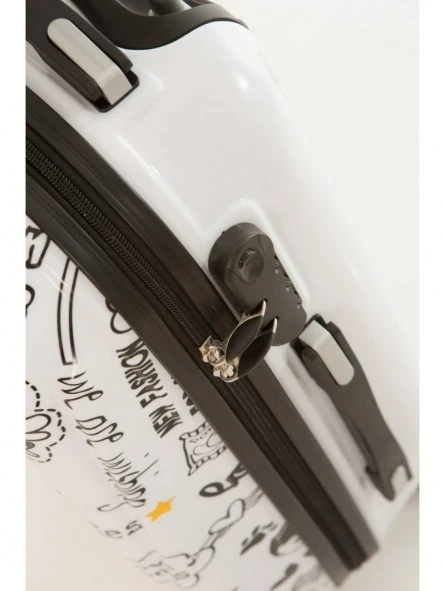Maleta mediana modelo Holliday rígida de color blanco con dibujos, dispone de unas medidas exteriores de 65x42x25 cm un peso de 3.15 kg y una capacidad interior de 65 litros.