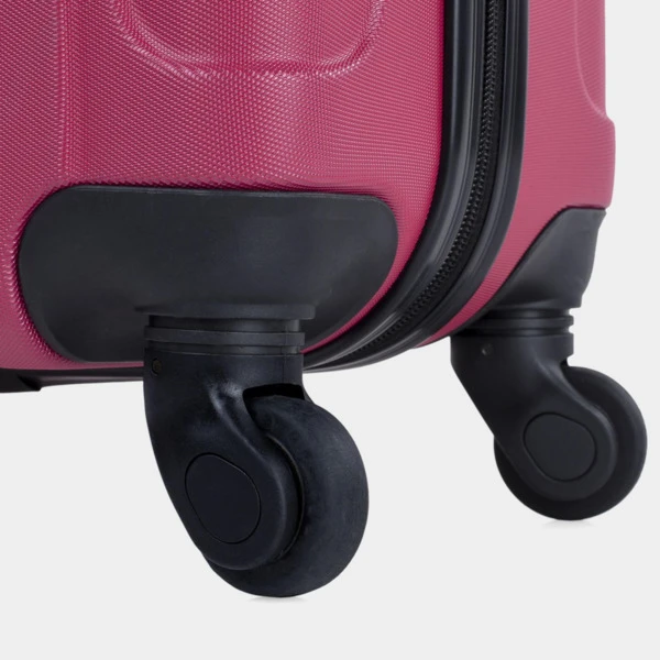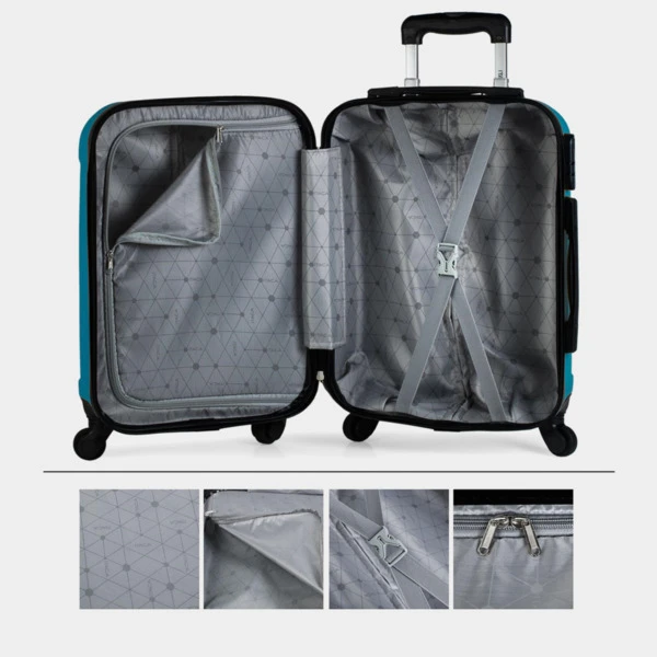 Set de neceser + 3 maletas tamaño 50/60/70 realizadas con ABS, un material ligero y a la vez resistente. Otra ventaja es que permite mayor maniobrabilidad con sus 4 ruedas giratorias 360° multidirección de suave rodamiento y su trolley telescópico con seguro hacen que su manejo sea más cómodo. Dispone de una cremallera con doble cursor y cerradura con combinación LOCK para una mayor seguridad. En su interior, contemplamos el forro personalizado de la marca, con separación central. Contiene correas elásticas interiores que permiten la sujeción del contenido.