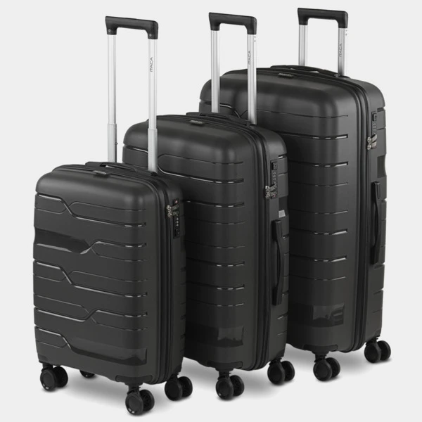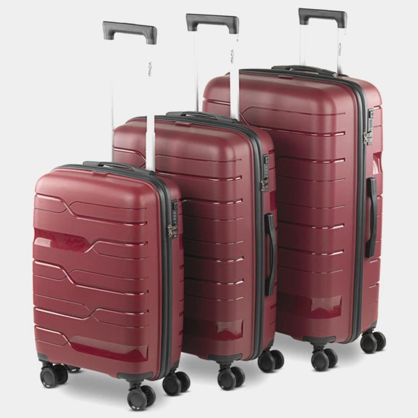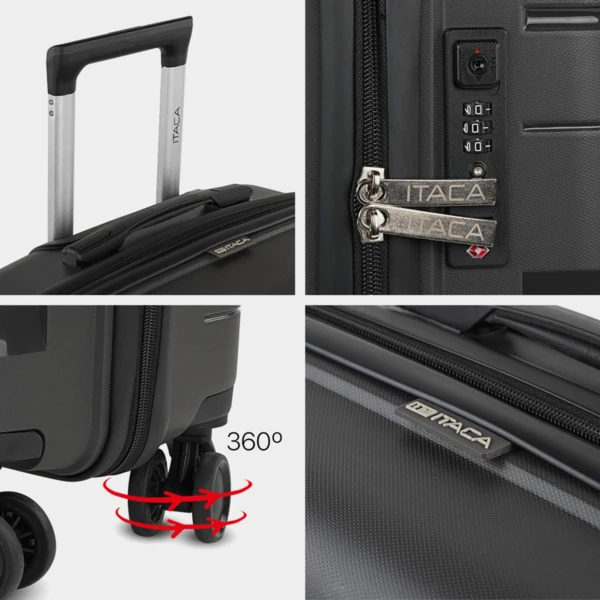 Juego de 3 maletas de viaje con ruedas de la firma ITACA fabricadas con Polipropileno PP. Hemos utilizado Polipropileno de alta tecnología. Este material es ultra resistente y súper ligero, el mejor material sintético para la fabricación de maletas. Alta resistencia y durabilidad. Combinación ideal para viajes largos. Son las maletas más recientes y de mayor calidad. la evolución de la marca ITACA continua buscando la mejor calidad a el mejor precio. Este set de 3 maletas te ofrece una combinación ideal para todo tipo de viajes, de fin de semana, cortos y largos. Para homologar internacionalmente, hemos incorporado la cerradura TSA, de esta forma no tendrás problemas en ninguna aduana de mundo. Características principales: Dimensiones: Cabina (Cumple la normativa de equipaje de mano de EasyJet, Iberia, Ryanair, etc.). Total: 39.5 x 55 x 21 cm. Volumen: 39 L. Peso: 3.20 kg. Mediana: Total: 45 x 67.5 x 30 cm. Volumen: 77 L. Peso: 4 kg. Grande XL: Total: 55 x 77.5