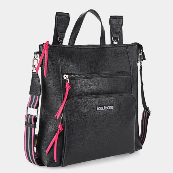 Mochila Casual Mujer. Bolso Mujer Mochila. Diseño único, original y exclusivo de la marca LOIS. Mochilas Mujer Casual – Mochila Antirrobo Mujer. Características Especiales: Mochila multifunción con bandolera larga adicional. Bolsillo interior acolchado apto para dispositivos de hasta 13″. Bolsillos interiores organizadores. Bolsillo trasero e interior con cierre de cremallera. Mochila Mujer Antirrobo – Mochila Negra Mujer. Exterior: Piel sintética la cual cumple con los standars Eco-friendly. Interior: Forro al tono y etiqueta interior representativa de la marca. Mochila Mujer Viaje – Mochila Viaje Mujer. A destacar el logo al tono , las cremalleras inyectadas , el toque de color en el cursor y la cinta decorada. Medidas: 30x32x7,5 cm. Peso: 0,95 kg. Material: Polipiel.