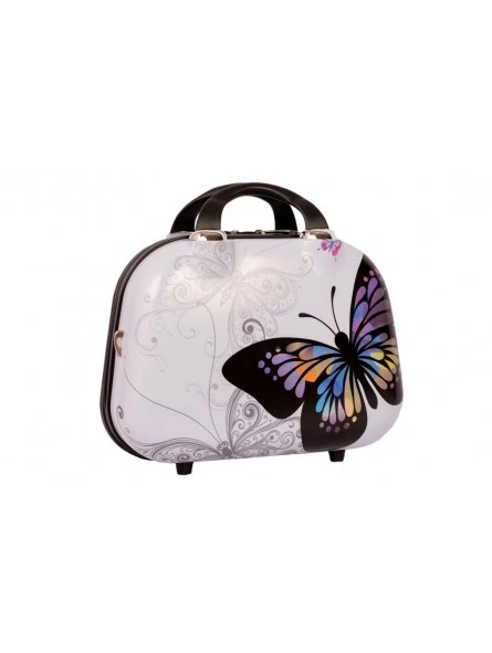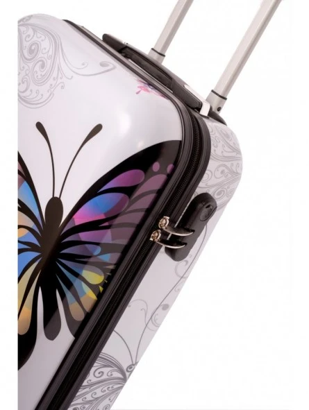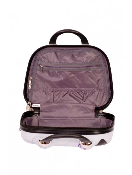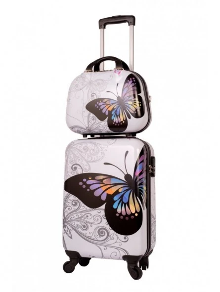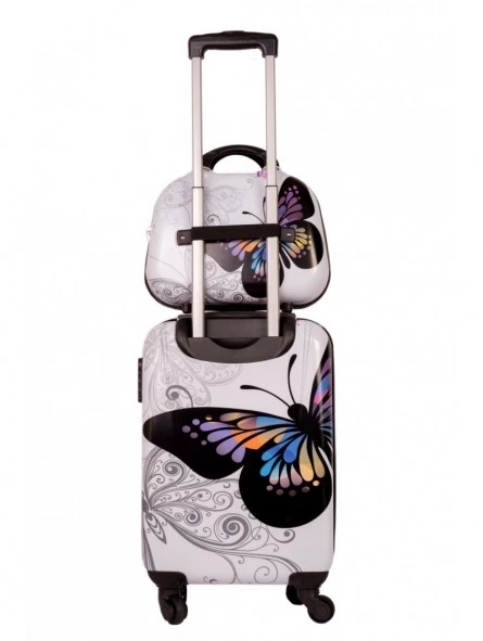 Bonito conjunto color blanco de maleta más neceser, la maleta es tamaño cabina con medidas 55x35x20 cm, rígida con 4 ruedas y con candado de combinación integrado e el lateral, más un neceser a juego también rígido el cual se puede adaptar a la maleta, llevar a mano o en bandolera, con medidas 35x28x14 cm.